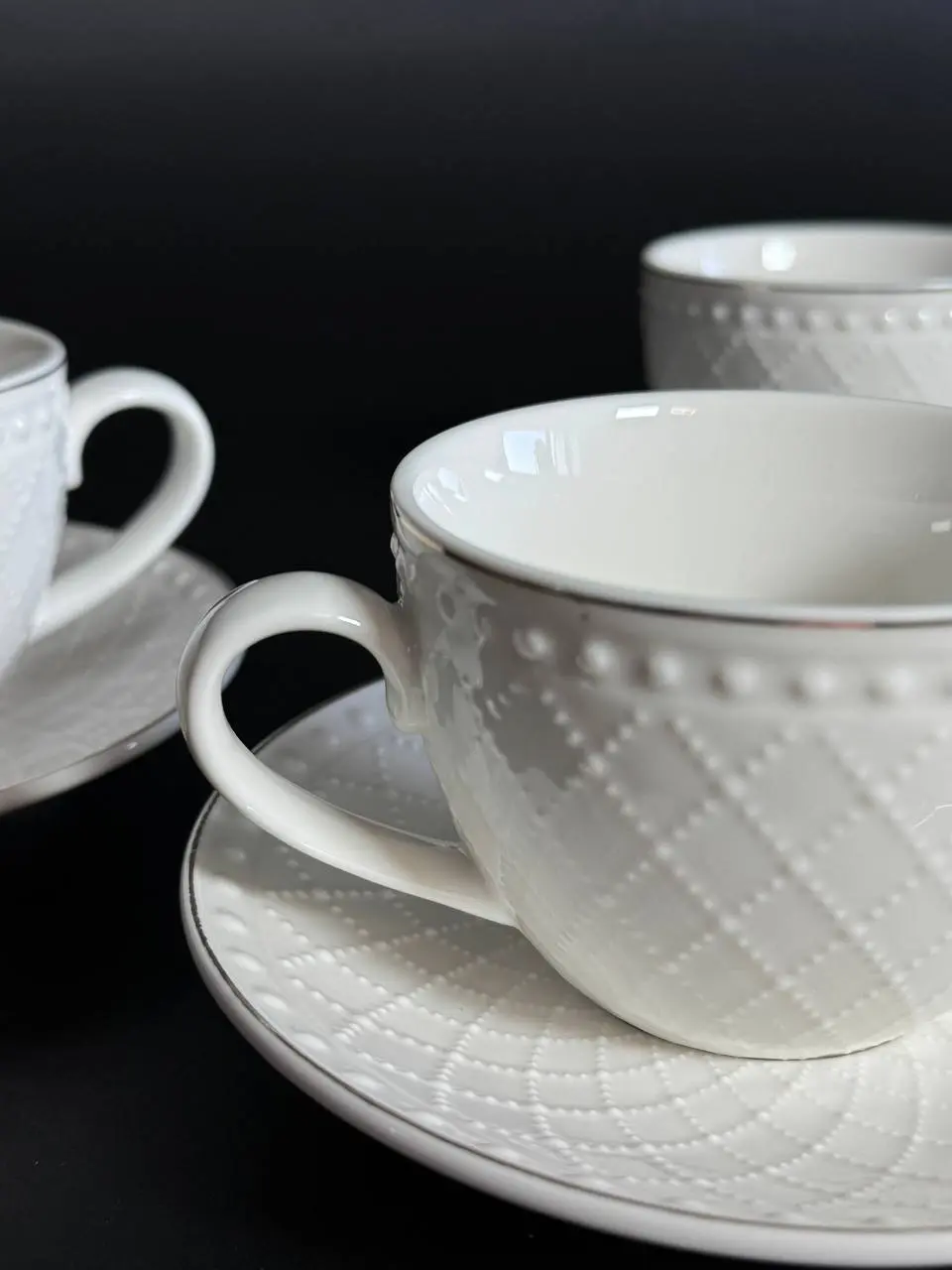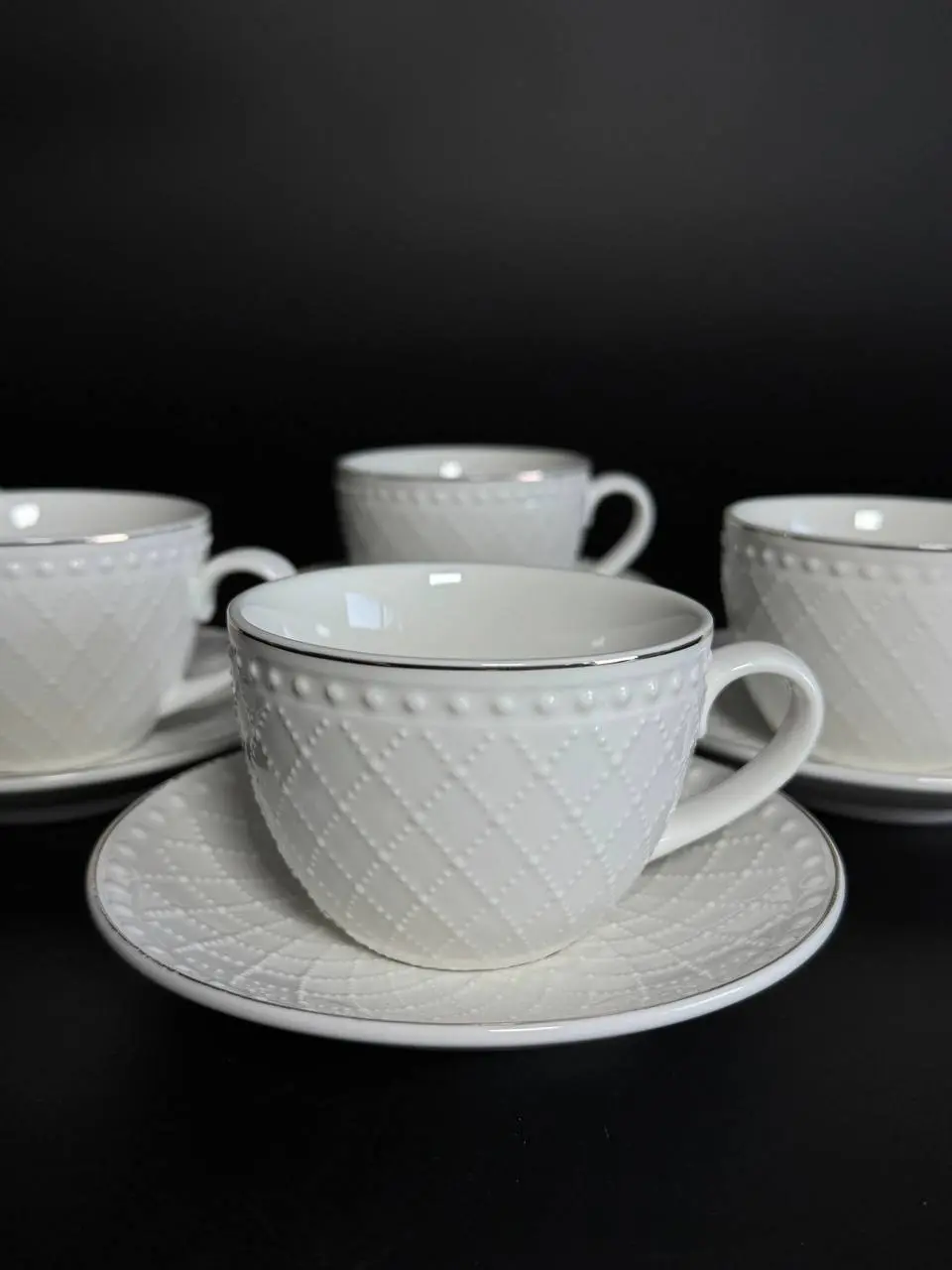 Компактний чайний сервіз 30-7 з делікатним рельєфним малюнком та тонкими смужками. Легкий, витончений та дуже естетичний, він доповнений акуратним золотим обідком, що надає святкового настрою. Ідеально підходить для затишних чаювання або стильного подарунка.