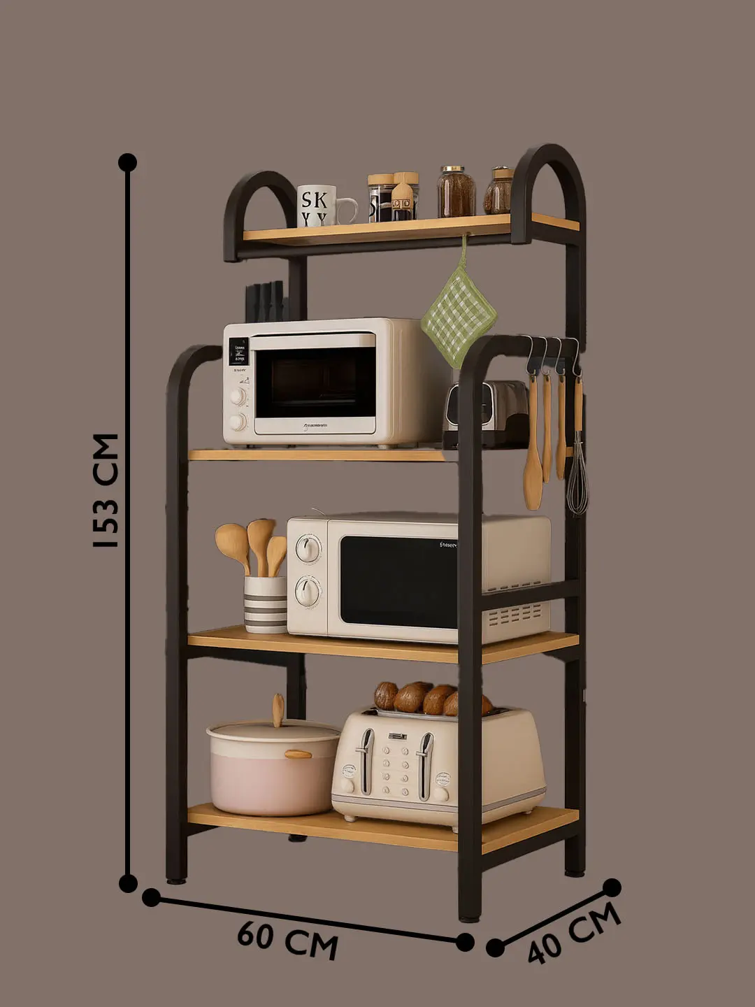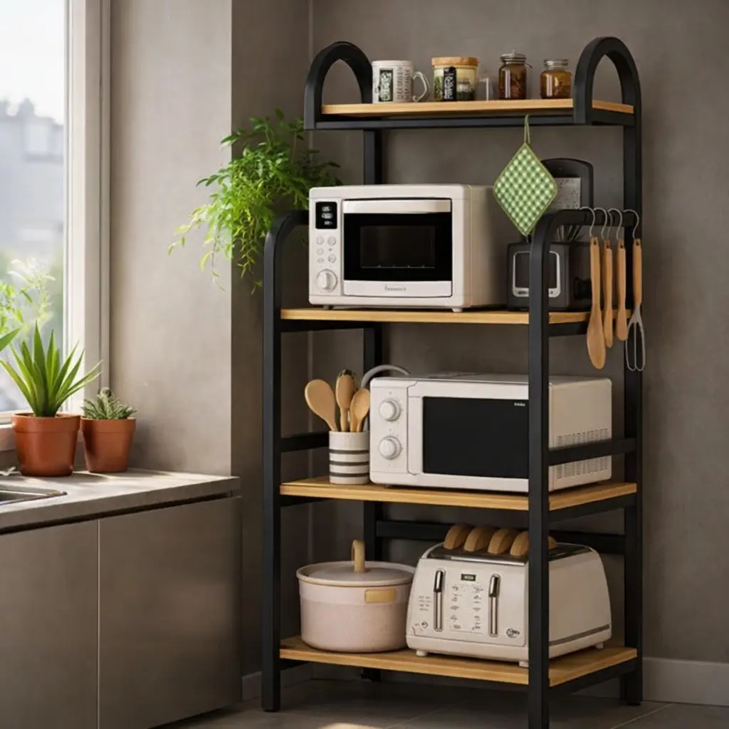 Завдяки п'яти рівням зберігання полиця забезпечує достатньо місця для великих кухонних приладів, таких як мікрохвильова піч і кухонне начиння, а також спеціальним полицям для організації пляшок і кулінарних книг, щоб акуратно організувати вашу кухню.