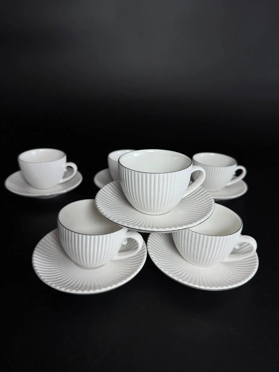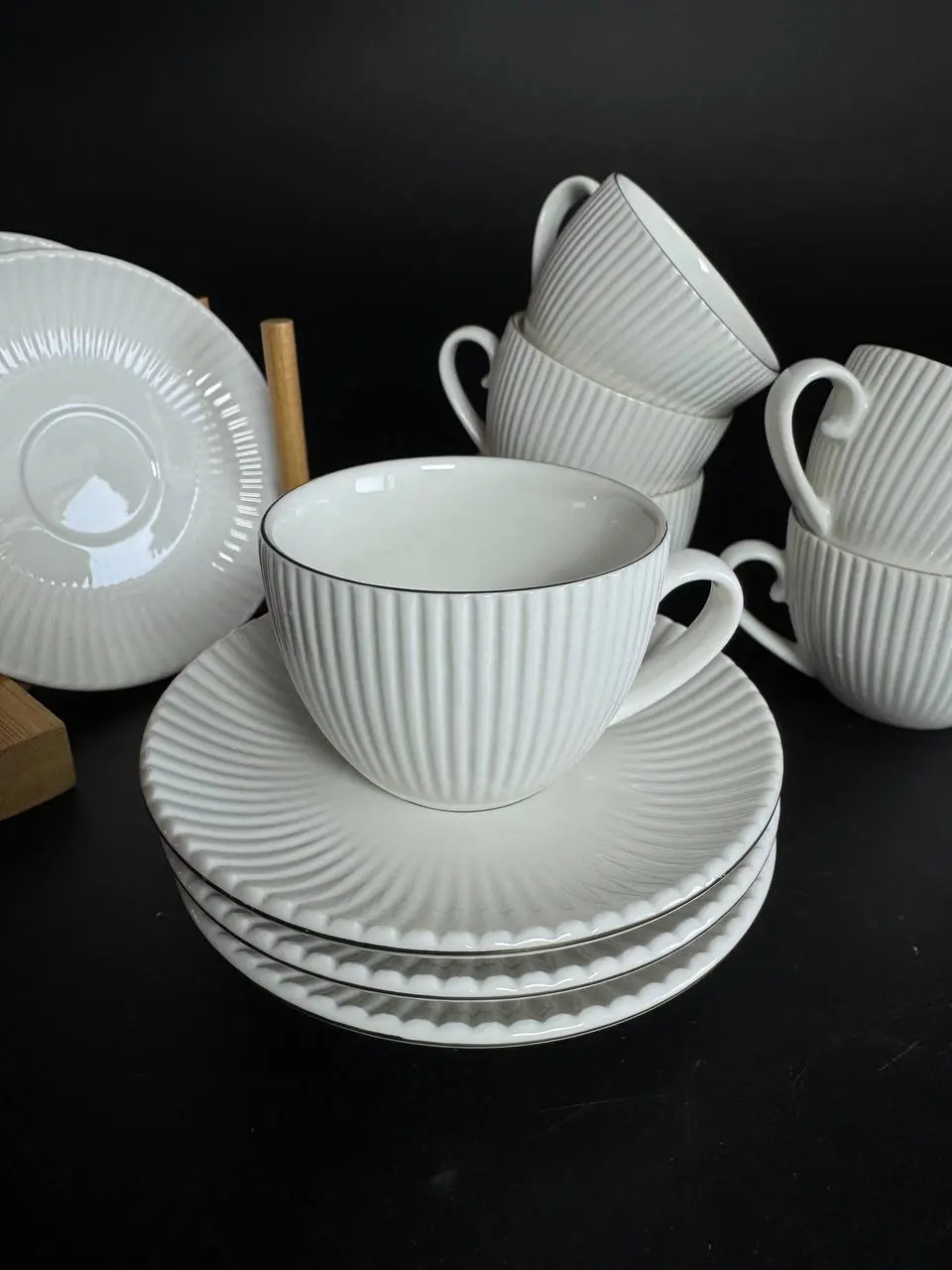 Чайний сервіз 30-1 з м'якою рельєфною фактурою, де смугастий візерунок виглядає особливо гармонійно. Золота окантовка делікатно підкреслює форму чашок та тарілок, роблячи легким, вишуканим та дуже привабливим сервізом. Прекрасний варіант для повсякденного використання із ноткою розкоші.