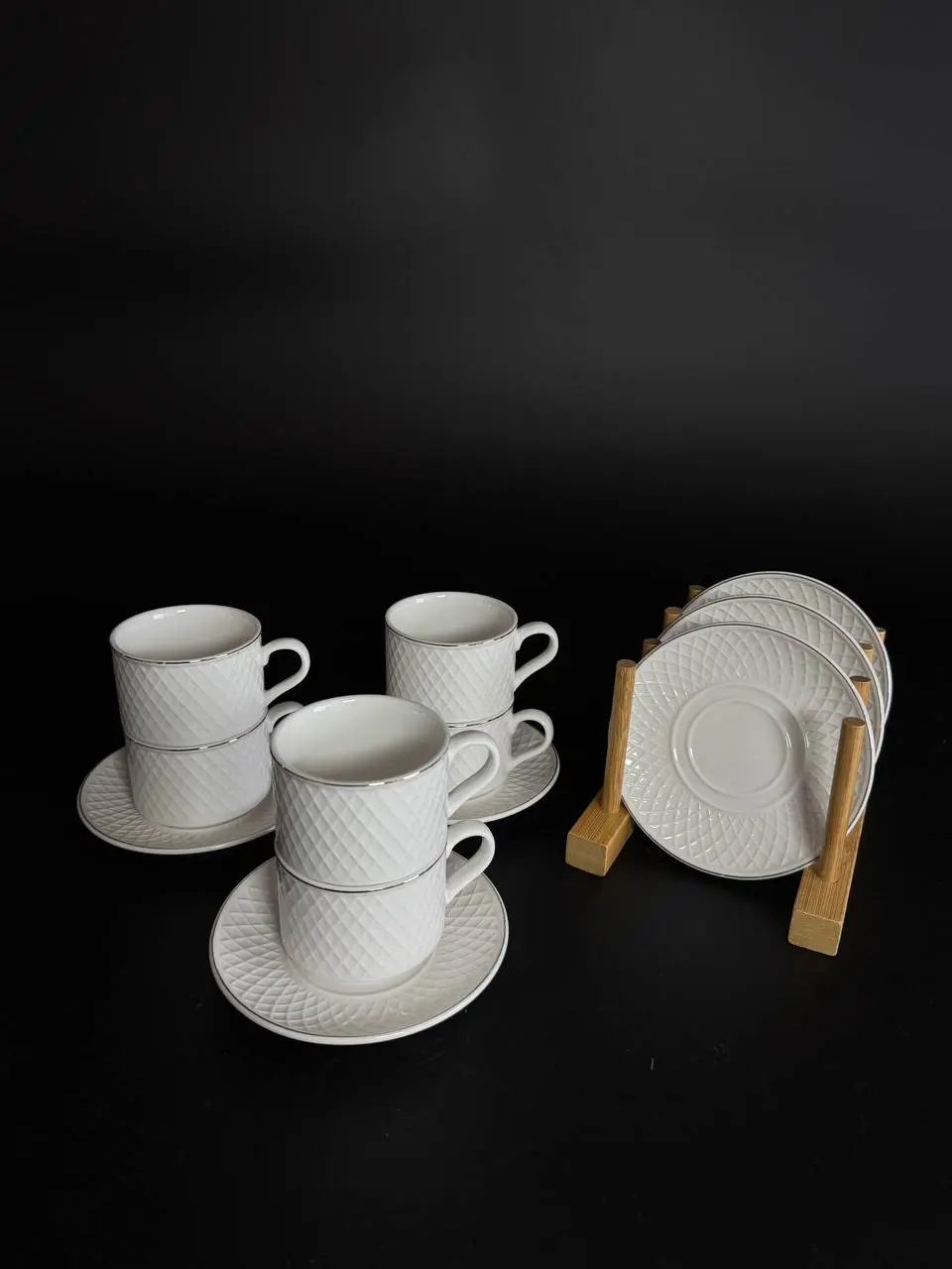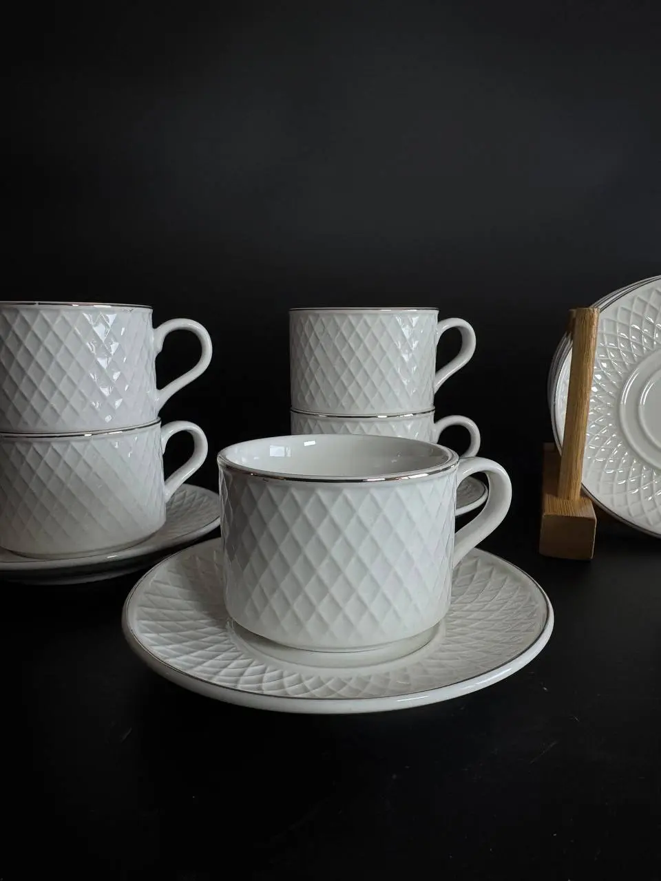 Компактний чайний сервіз 30-5 з делікатним рельєфним малюнком та тонкими смужками. Легкий, витончений та дуже естетичний, він доповнений акуратним золотим обідком, що надає святкового настрою. Ідеально підходить для затишних чаювання або стильного подарунка.