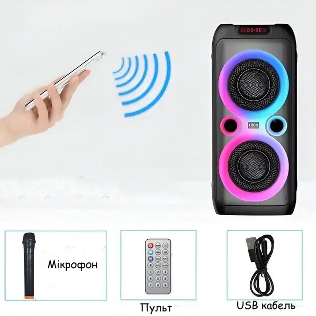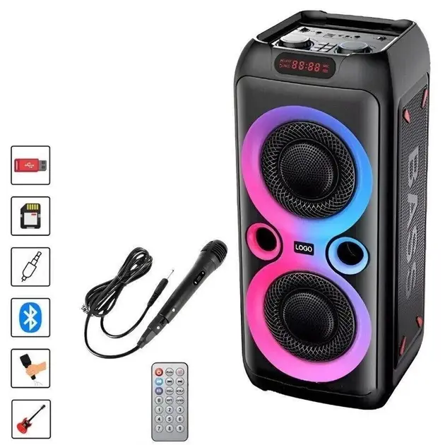 Bluetooth колонка TTD-2809 потужністю 20Вт – це сучасний пристрій з чудовою якістю звуку та яскравими світловими ефектами. Два потужні 8-дюймові динаміки забезпечують чисте та гучне звучання, а вбудоване LED підсвічування синхронізується з музикою, створюючи незабутню атмосферу.