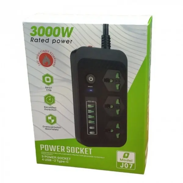 Мережевий фільтр подовжувач 2 метри на 3 розетки, 4 USB 3.4A, 2 Type-C з вимикачем та заземленням 3000Вт 16А Power Socket J07 білий