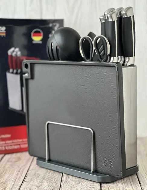Набір ножів та кухонного начиння – незамінний надійний помічник на Вашій кухні. У цей набір входить 5 ножів, ножиці, мусат, обробна досточка, кухонне приладдя на підставці.