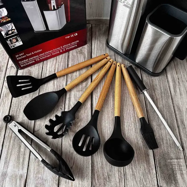 Набір кухонного приладдя виготовлений із харчового, термостійкого, антипригарного силікону та добре відполірованого натурального дерева. Він безпечний для використання з харчовими продуктами, не токсичний, без запахів, витримує температуру до 230°С.