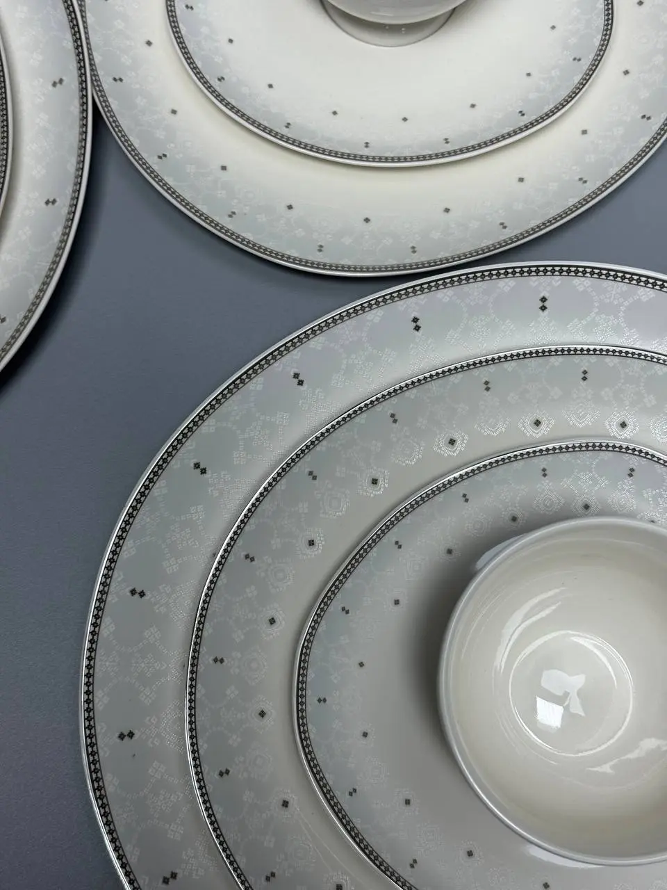 Столовий сервіз RG 1116 вражає своєю благородною простотою. Слоново-кремовий фарфор із плавними формами виглядає дорого та вишукано, а акуратна срібна окантовка підкреслює статусність виробу, додаючи нотку стриманої розкоші.