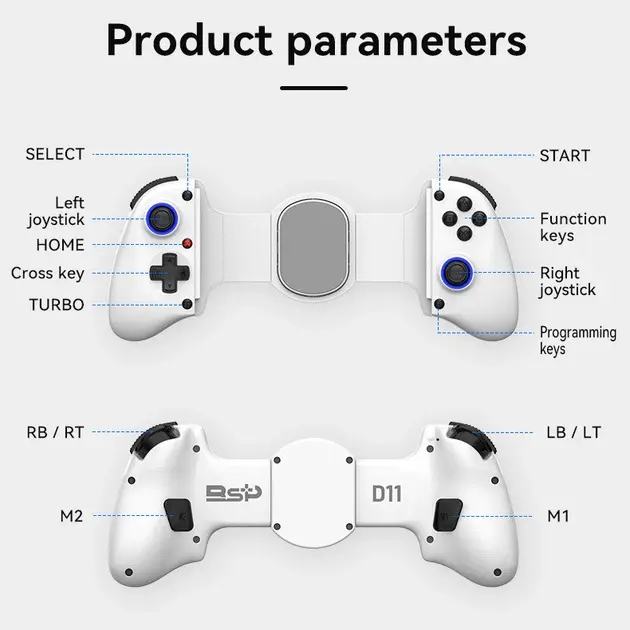 Геймпад BSP-D11 – це інноваційний пристрій для комфортної та точної гри. Білий колір корпусу та продуманий ергономічний дизайн роблять його стильним та функціональним аксесуаром для любителів мобільного та консольного геймінгу.