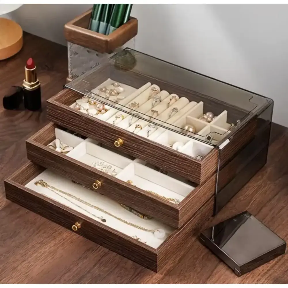 Скринька-органайзер для прикрас з трьома висувними ящиками призначена для акуратного зберігання кілець, сережок, браслетів, годинників та інших аксесуарів. Внутрішня організація включає роли для кілець, маленькі осередки для маленьких прикрас та просторий відсік для величезних виробів. Прозора кришка захищає вміст від пилу та дозволяє бачити всі прикраси без необхідності відкривати органайзер.