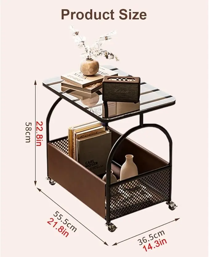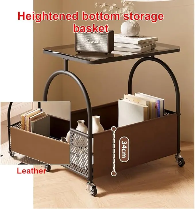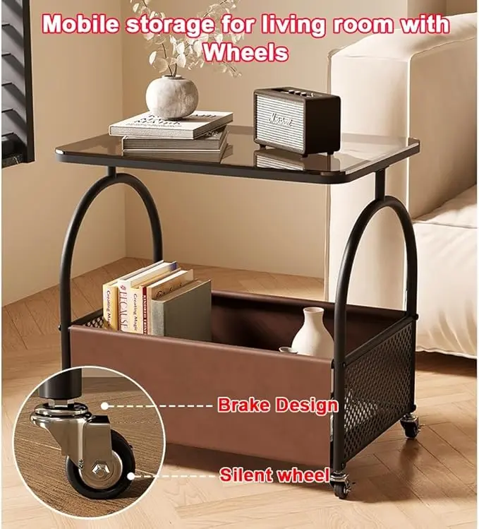 Функціональний та сучасний столик, що ідеально підходить для спальні, вітальні або робочої зони. Поєднання металевого каркаса, скляної стільниці та місткої нижньої корзини робить її зручною та практичною у щоденному використанні.