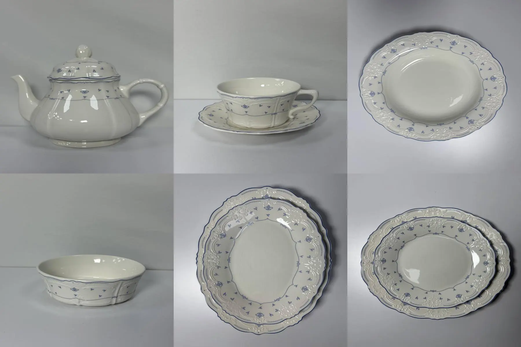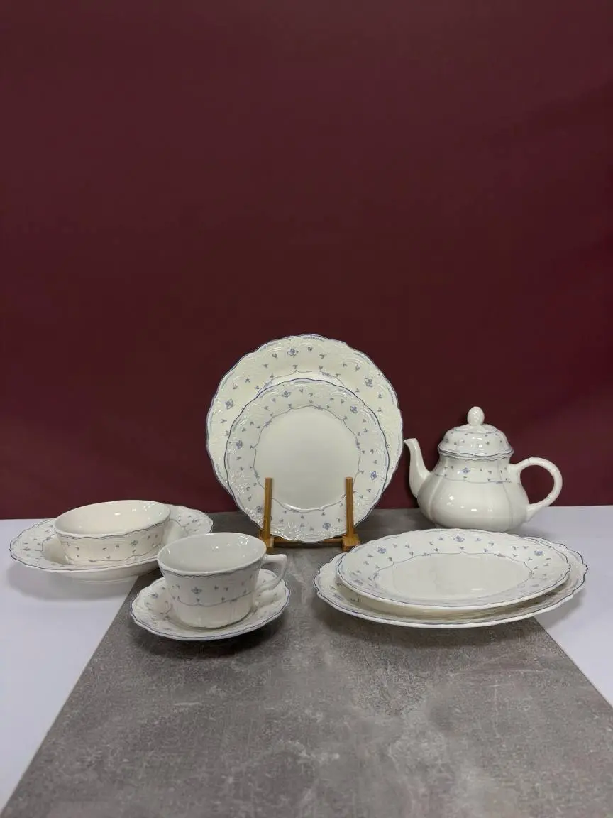 Столовий сервіз DY05 — чистий білий фарфор із витонченою блакитною каємкою створює відчуття свіжості і стриманої елегантності. Він однаково доречно доповнить як святковий стіл, так і щоденні трапези, підкреслюючи акуратний смак і любов до класичних деталей.