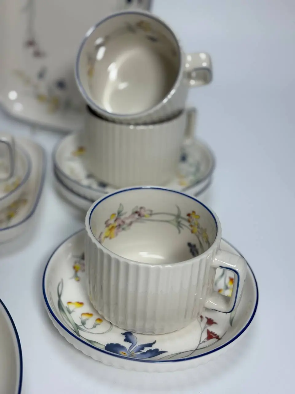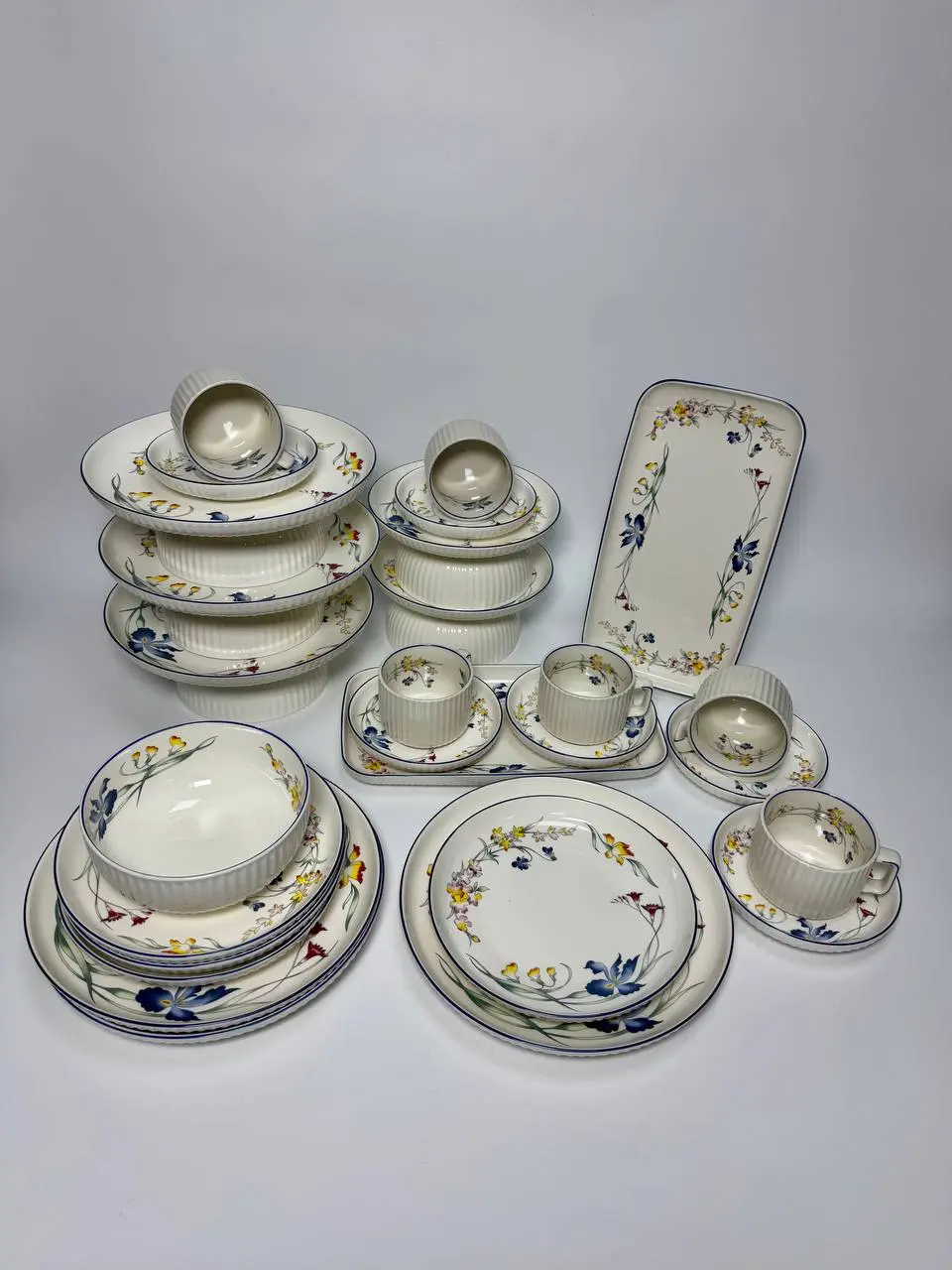 Столовий сервіз RG 1122 — це гармонійне поєднання класичної елегантності та ніжної романтики. Молочно-білий фарфор із рельєфною фактурою створює відчуття тепла й затишку, а витончені квіткові мотиви в жовто-блакитних відтінках додають сервізу легкості та природної краси. Тонка темно-синя окантовка акуратно підкреслює форму кожного предмета, надаючи сервіруванню завершеного й благородного вигляду.