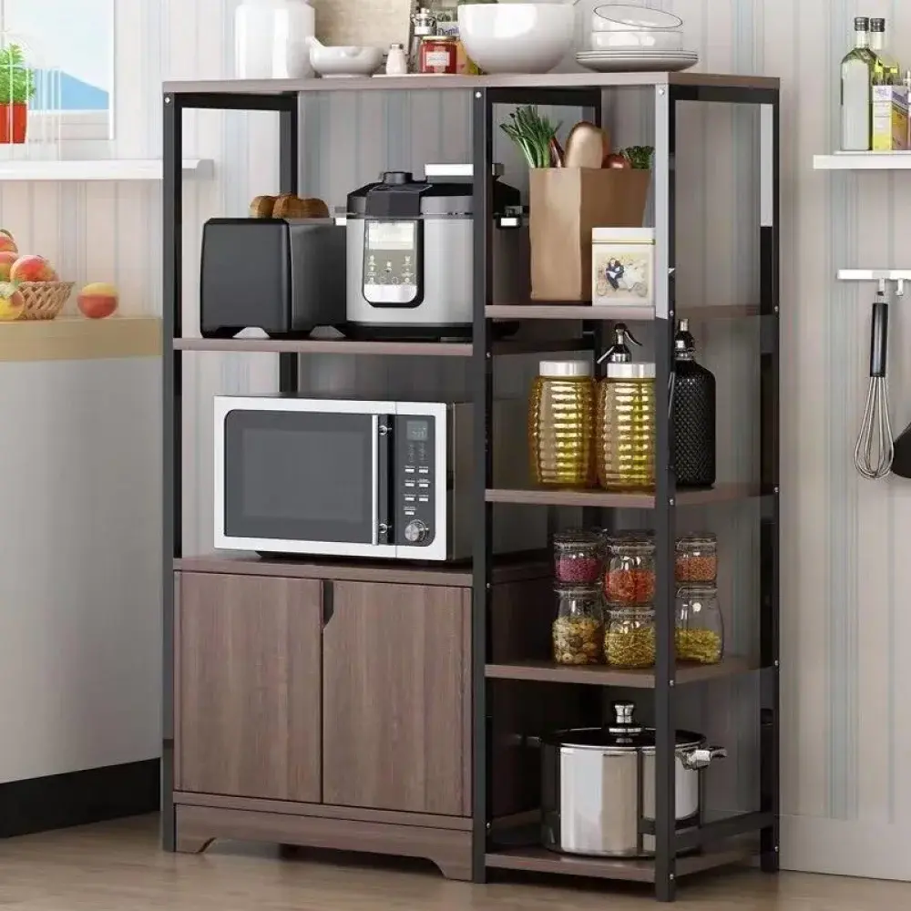 Функціональний кухонний стелаж - ідеальне рішення для організації техніки, посуду та продуктів. Поєднує відкриті полиці та закриту шафу, дозволяючи зручно зберігати все необхідне та підтримувати порядок на кухні.